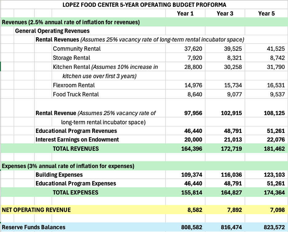 The Lopez Food Center has a very strong and well-planned operating budget that has been vetted several times by financial experts. It projects rental revenues of $98K in year 1 rising to $108K in year 5. Revenues come from rental income on the various spaces in the Food Center.