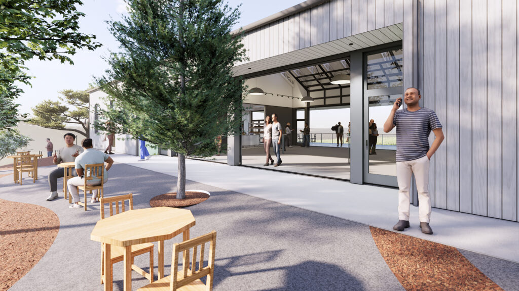 - Space for food trucks to park permanently where customers will have access to covered seating and easily accessible restrooms.